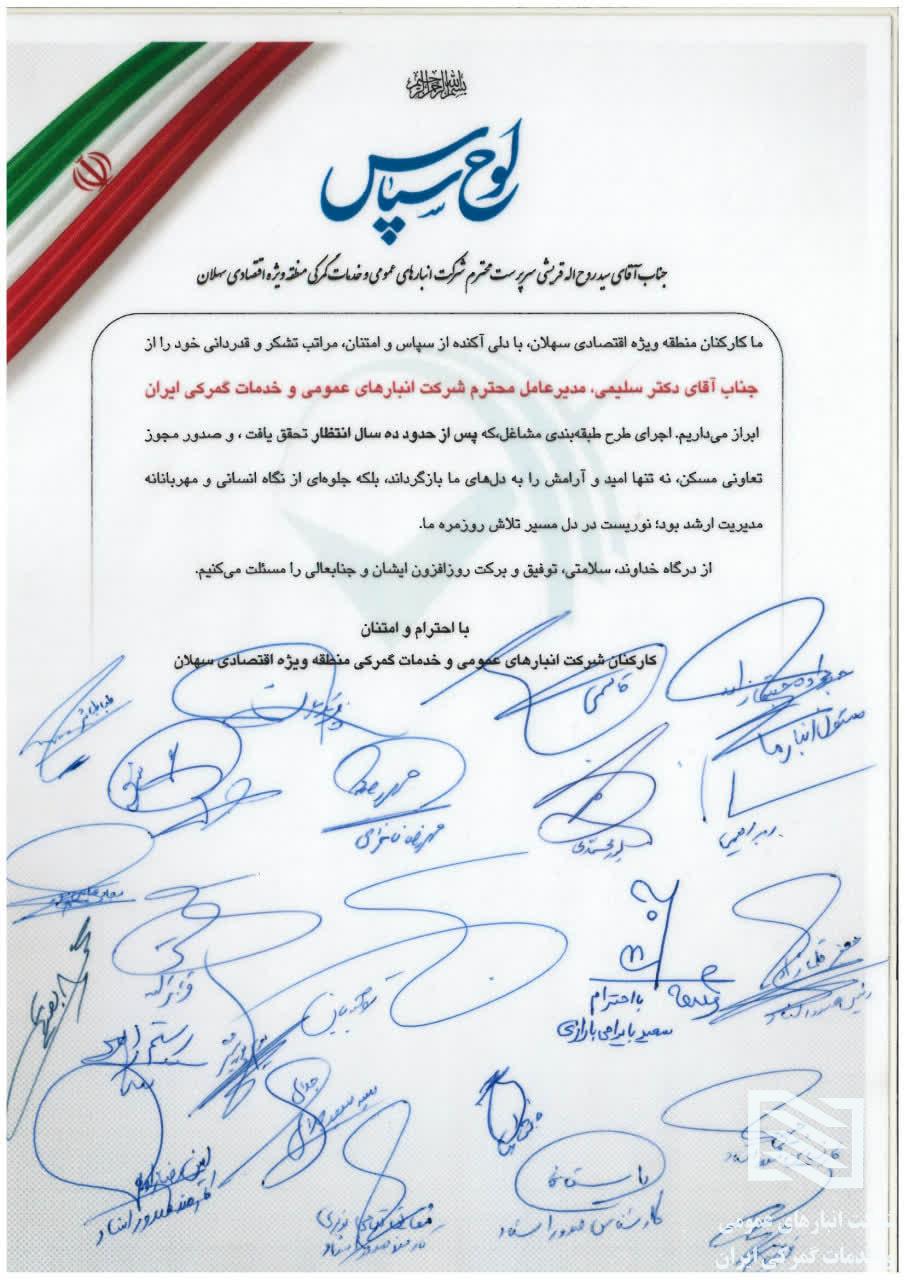 در پایان این مراسم، روح الله قریشی، مدیرعامل شرکت انبارهای عمومی سهلان، ضمن ارائه گزارشی از اقدامات انجام شده و چالشهای موجود، از درایت و تدبیر دکتر سلیمی در پیشبرد اهداف شرکت قدردانی کرد و تقدیرنامهای از سوی تمامی کارکنان به ایشان اهدا نمود.